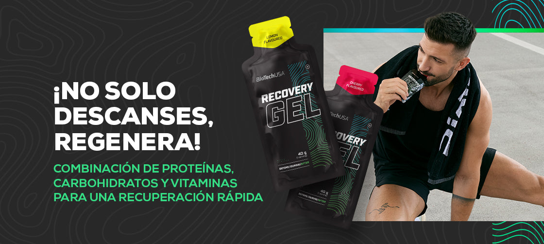 Gel complejo de suplemento dietético con carbohidratos y proteínas, con BCAA, L-glutamina, L-lisina, glucosamina, vitamina B6 y magnesio orgánico.
